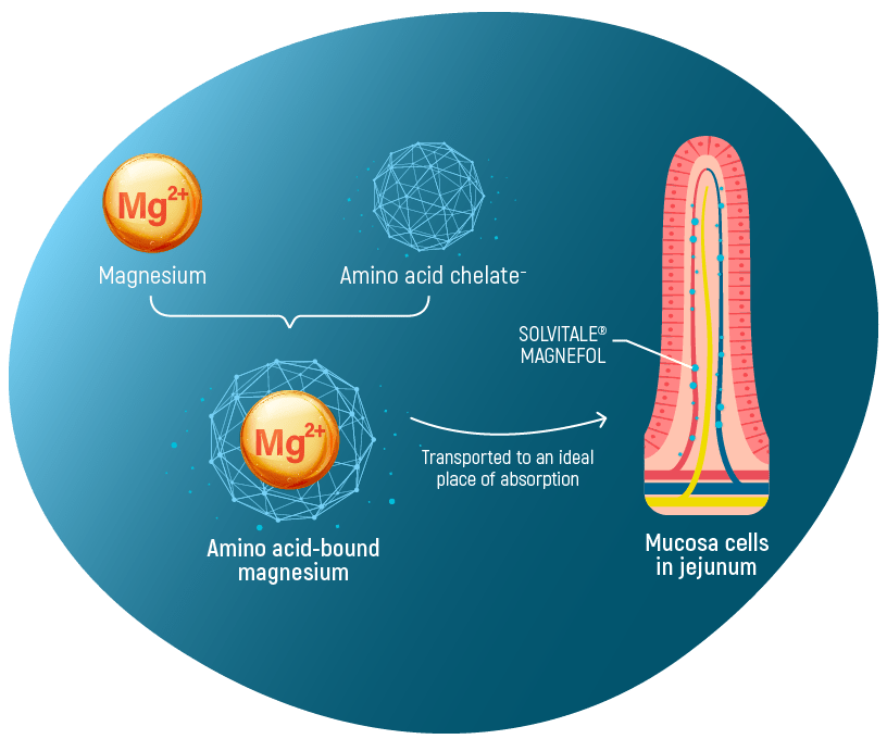 Latest generation magnesium in amino acid chelate form with folic acid. Magnesium and folic acid ensures continuous synthesis of all the genetic material and uplifts cellular energy production.